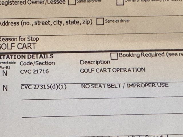 So there, amid the mayhem of Coachella traffic, surrounded by giant buses, thousands of pedestrians, and an atmosphere of near-planetary disorder, I was cited for two violations: illegally operating a golf cart on the street and not wearing a seatbelt in a vehicle that does not contain one.