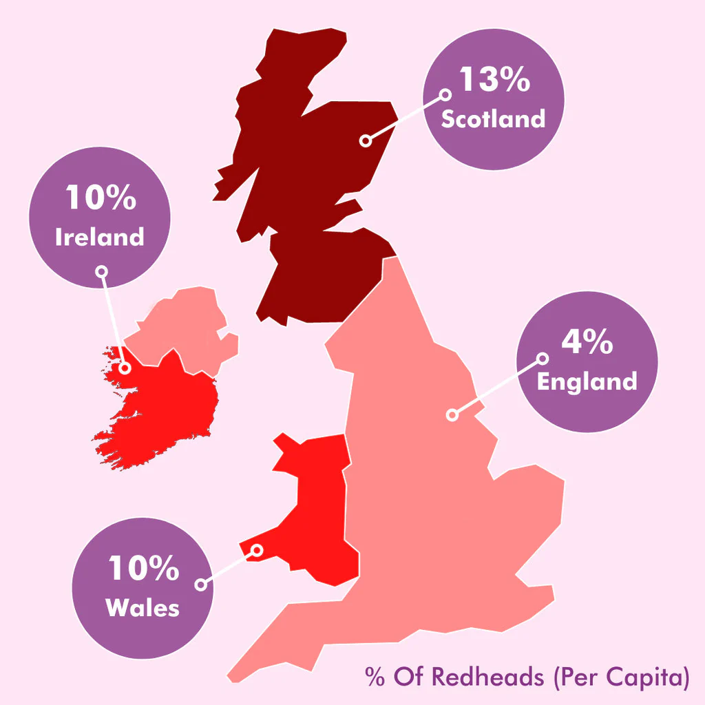 Interestingly, the highest concentration of redheads in the world is found in Scotland and Ireland, where roughly one in ten people may have red hair.